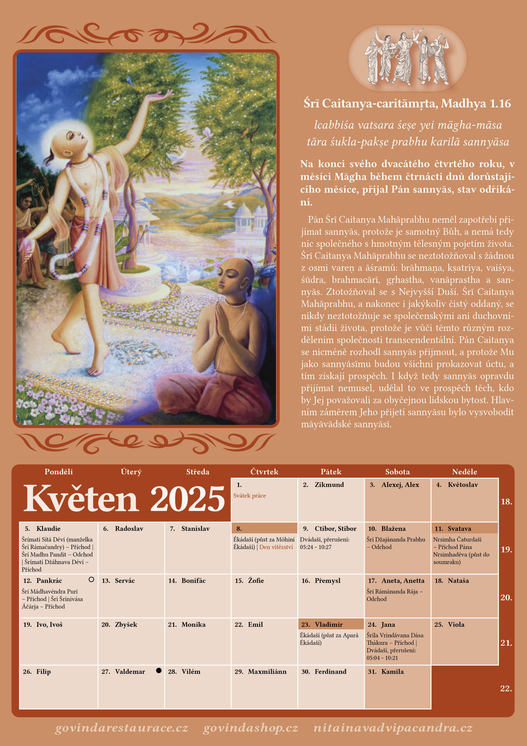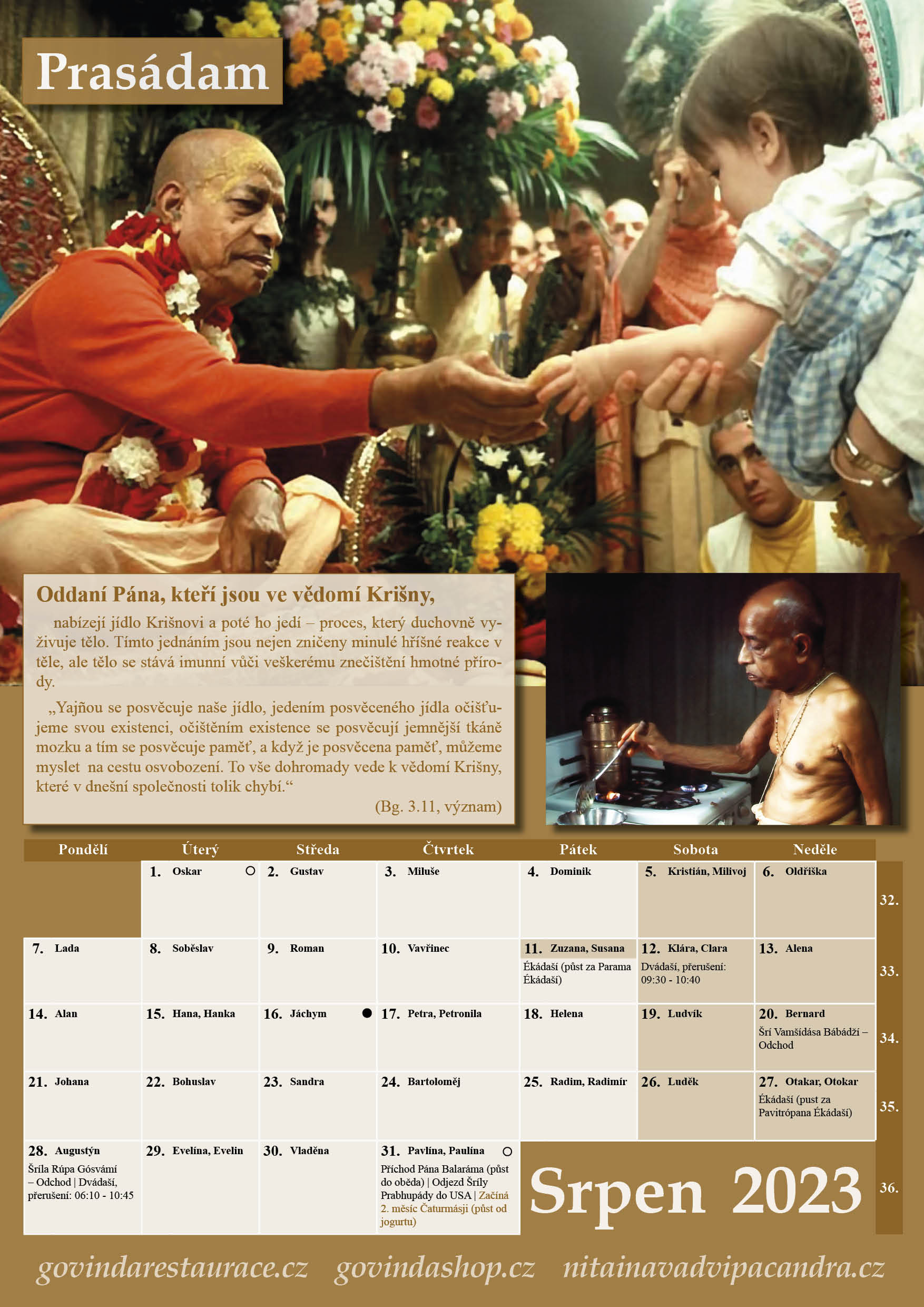 Media Multimediální nabídka přednášek, fotografií, videí, namluvených knih, historie daršanu Božstev, tábory, časopis Náma Hatta. 108 posledních přednášekČasopisyChrám LužceFoto – DaršanKnihySouhrnyŠríla PrabhupádaTábory Náma Hatta Vaišnavský kalendář Pro 15 Celý den Ékádaší (půst za Saphala Ékádaší) Pro 16 Celý den Dvádaší, přerušení: 07:55 – 10:37 Pro 20 Celý den Šrí Ločana Dása Thaákura – Příchod Pro 22 Celý den Šríla Džíva Gósvámi – Odchod, Šrí Džagadíša Pandita – Příchod Pro 30 Celý den Ékádaší (půst za Putradá Ékádaší) Pro 31 Celý den Dvádaší, přerušení: 08:01 – 10:44 Pro 31 Celý den Šrí Džagadíša Pandita – Příchod Led 7 Celý den Šrí Rámačandra Kavirádža – Odchod, Šríla Gópála Bhatta Gósvámí – Příchod Led 8 Celý den Šrí Džajadéva Gósvámí – Odchod Led 9 Celý den Šrí Lóčana Dása Thákura – Odchod. Led 14 Celý den Ékádaší (půst za Šat-tilá Ékádaší) Zobrazit kalendář